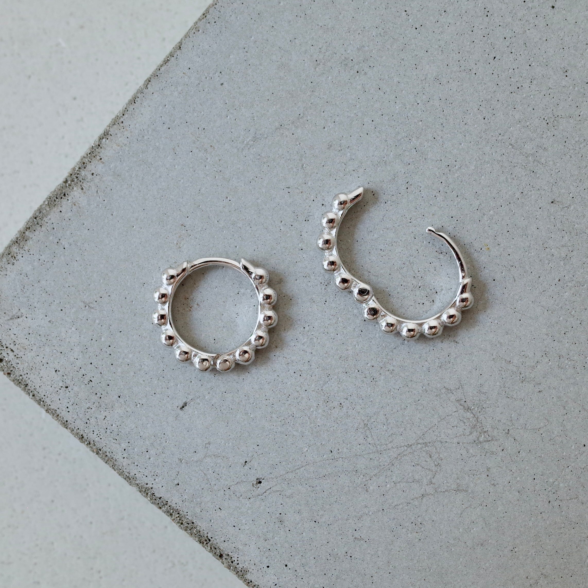 These hoop earrings feature a row of polished ball-like details that shimmer playfully with every movement.