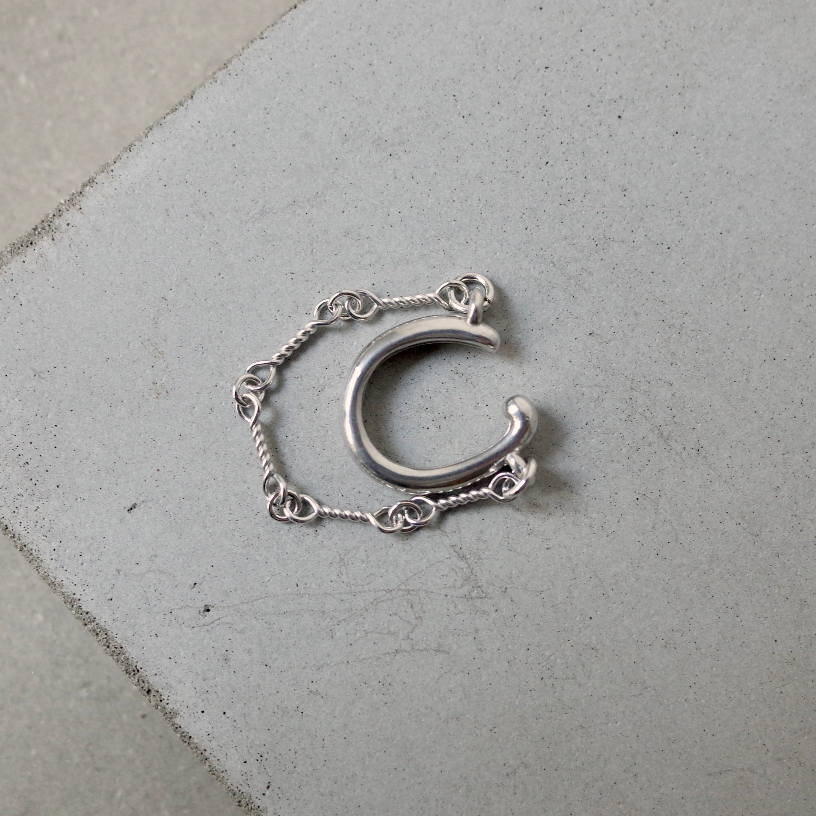 イヤーカフ本体とチェーンが重なりレイヤードしたように見えるイヤーカフ 。
