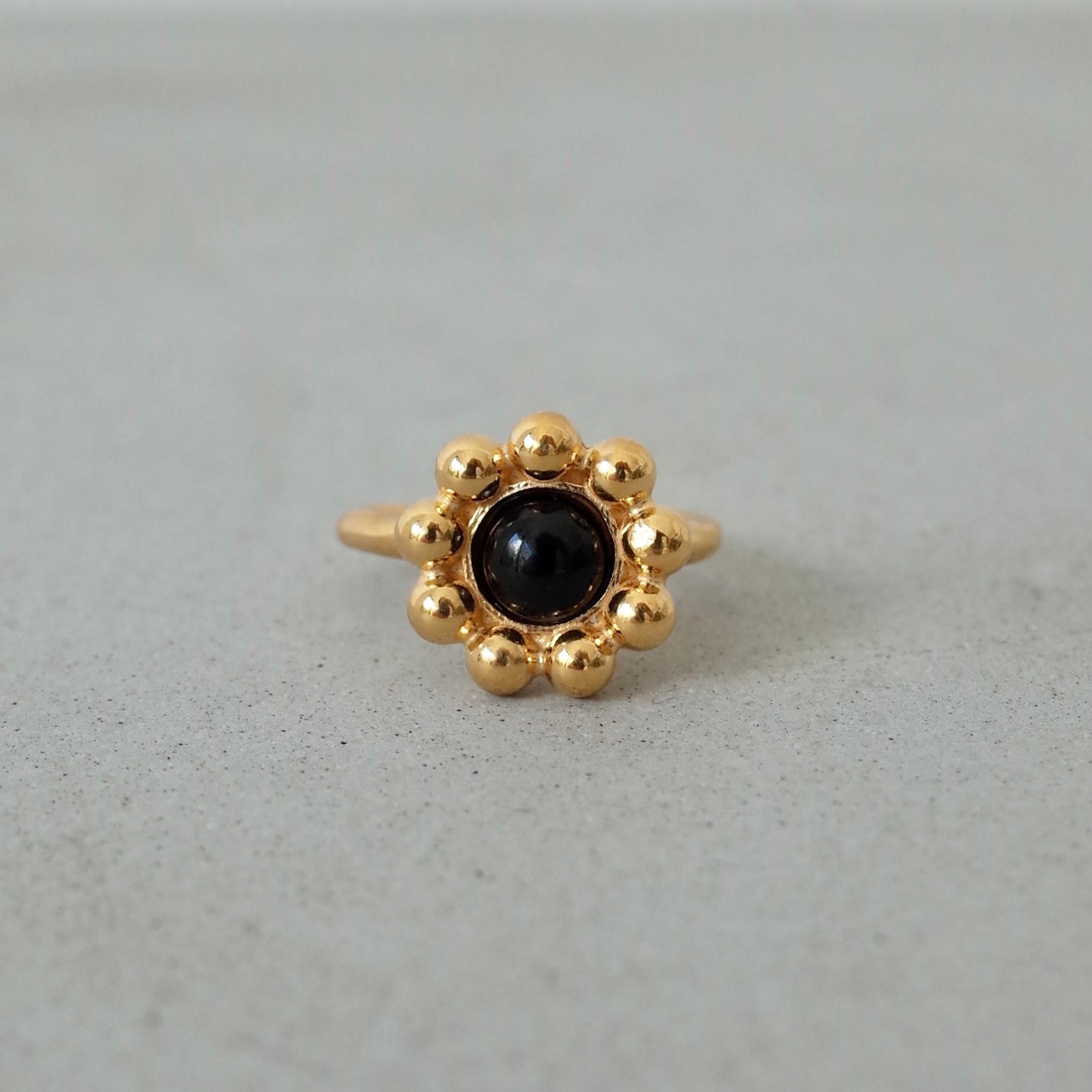 中央のオニキスを取り囲むように、小さな粒が連なり、まるで花のような形状が特徴。シンプルながらも存在感のあるデザインで、日常使いから特別なシーンまで幅広く活躍します。