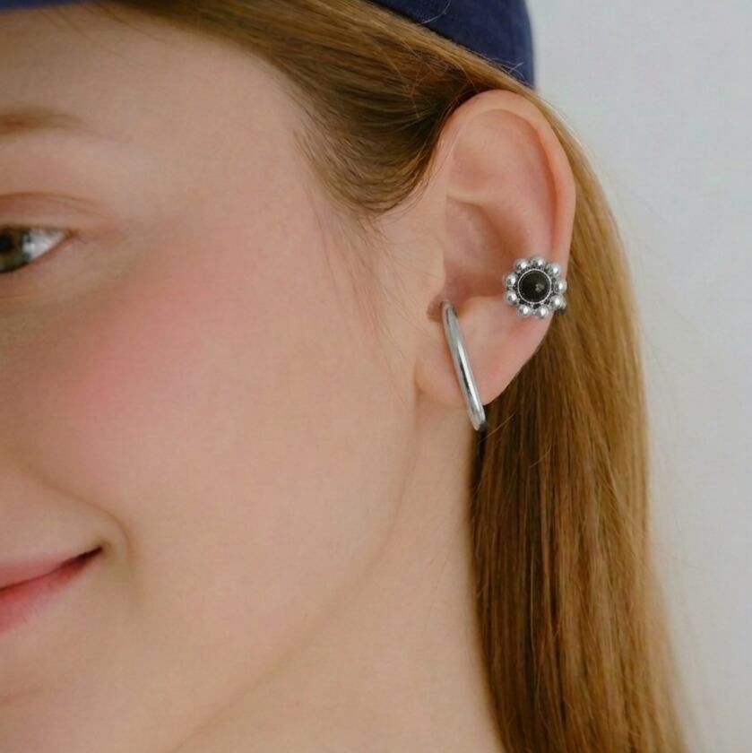 The charm of this earcuff is its classical design using onyx. The onyx at the center is surrounded by a series of small grains, giving it a flower-like shape. The design is simple yet has a strong presence, making it suitable for a wide range of occasions, from daily use to special occasions.