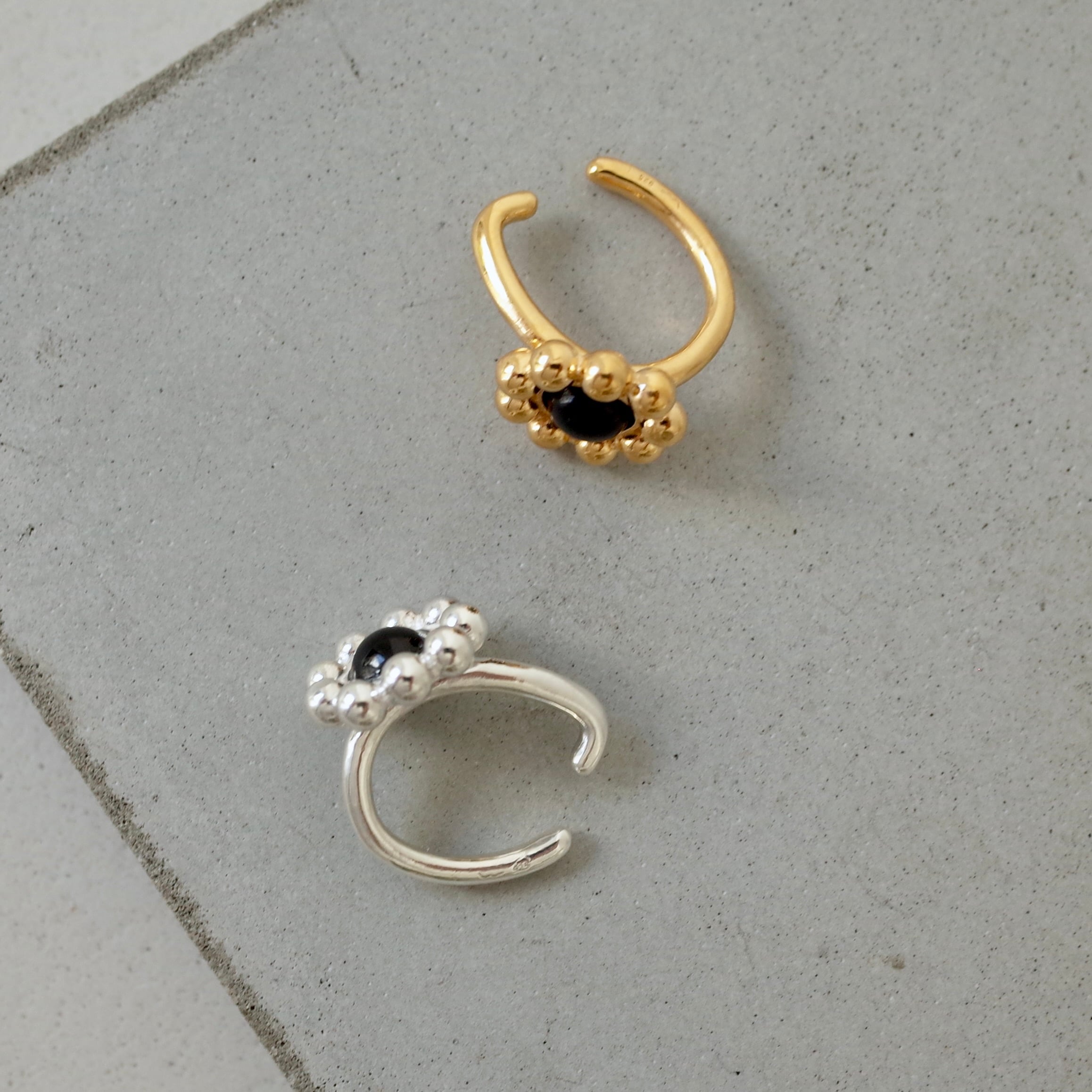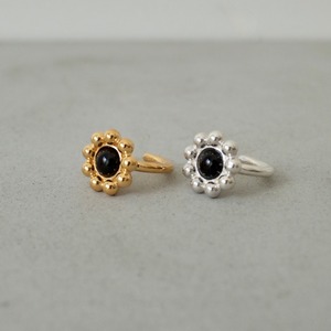The charm of this earcuff is its classical design using onyx. The onyx at the center is surrounded by a series of small grains, giving it a flower-like shape. The design is simple yet has a strong presence, making it suitable for a wide range of occasions, from daily use to special occasions.