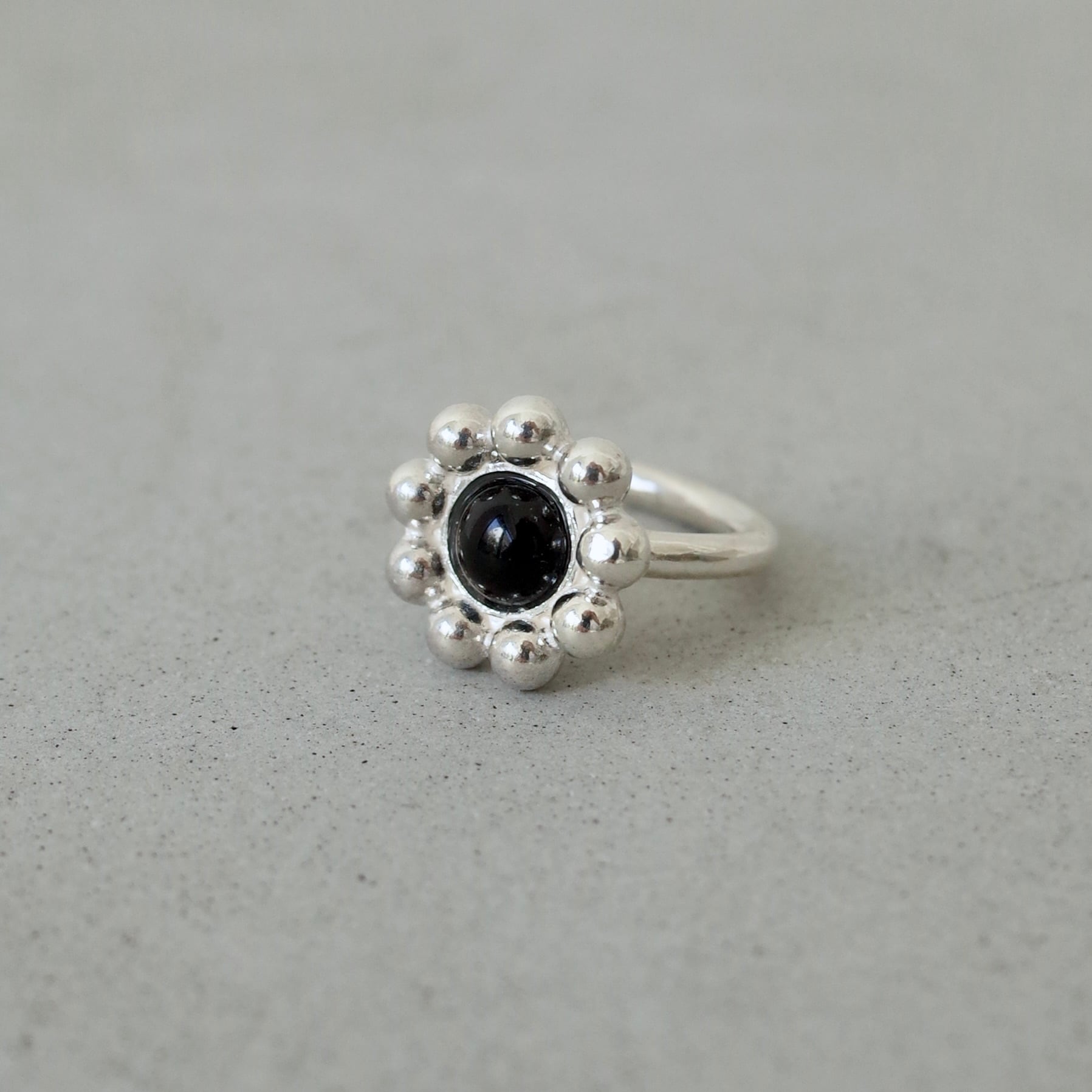 中央のオニキスを取り囲むように、小さな粒が連なり、まるで花のような形状が特徴。シンプルながらも存在感のあるデザインで、日常使いから特別なシーンまで幅広く活躍します。