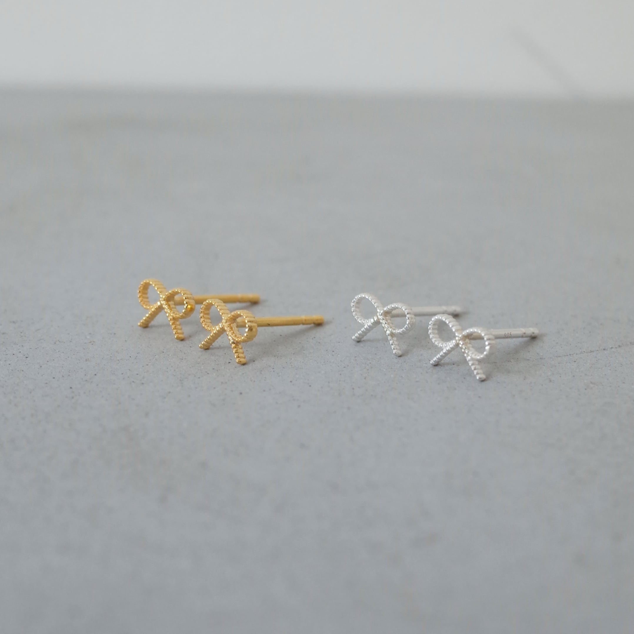 Delicate stud earrings featuring a ribbon motif formed by tiny dot details.