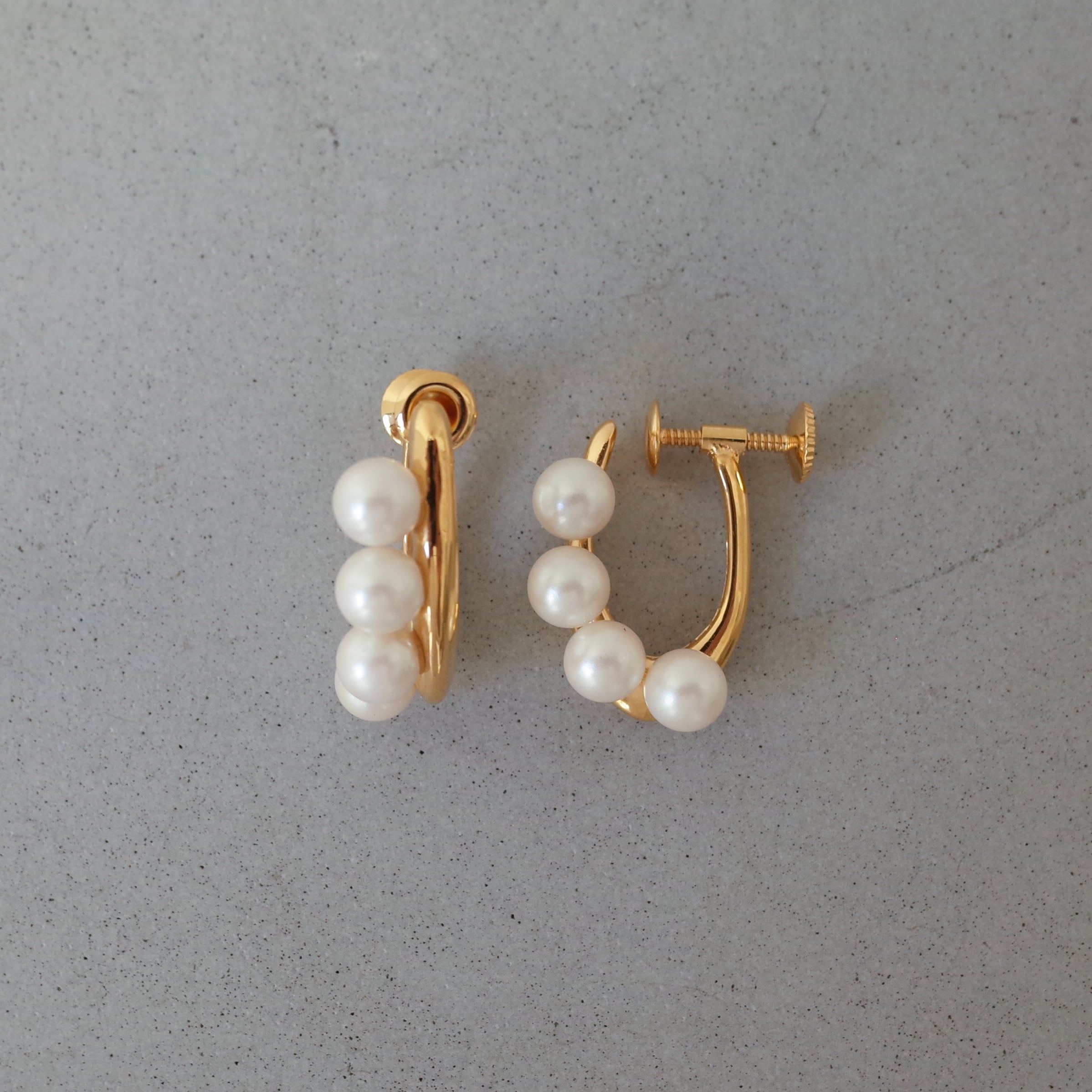 やわらかなカーブを描くフォルムに、パールを並べたイヤリング。
