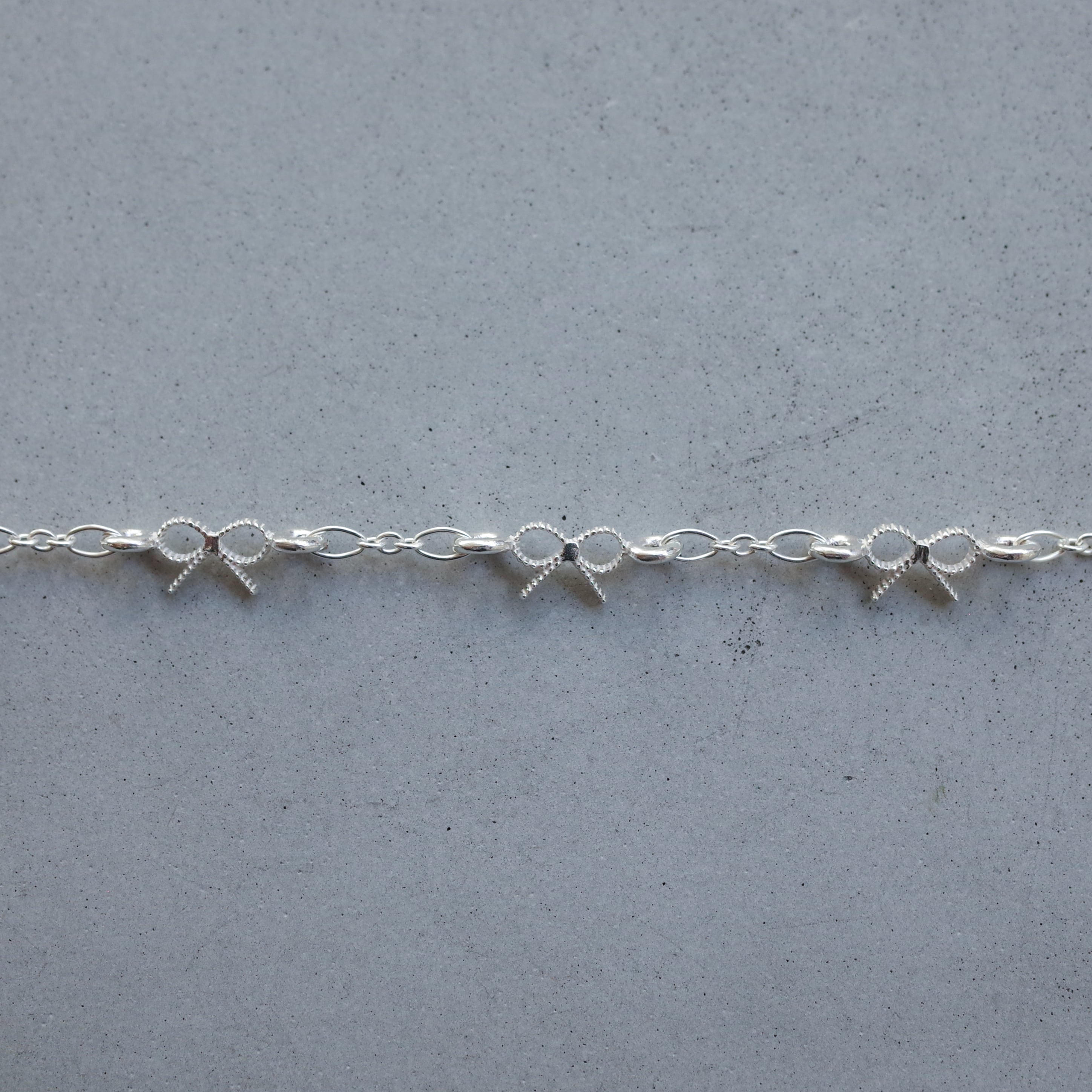 A delicate bracelet featuring a series of tiny ribbon motifs.