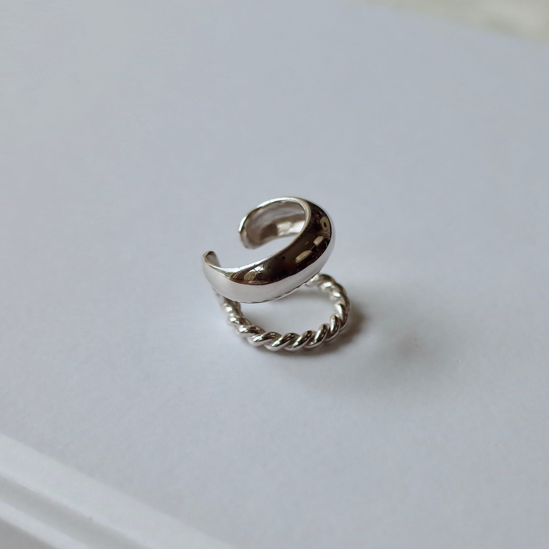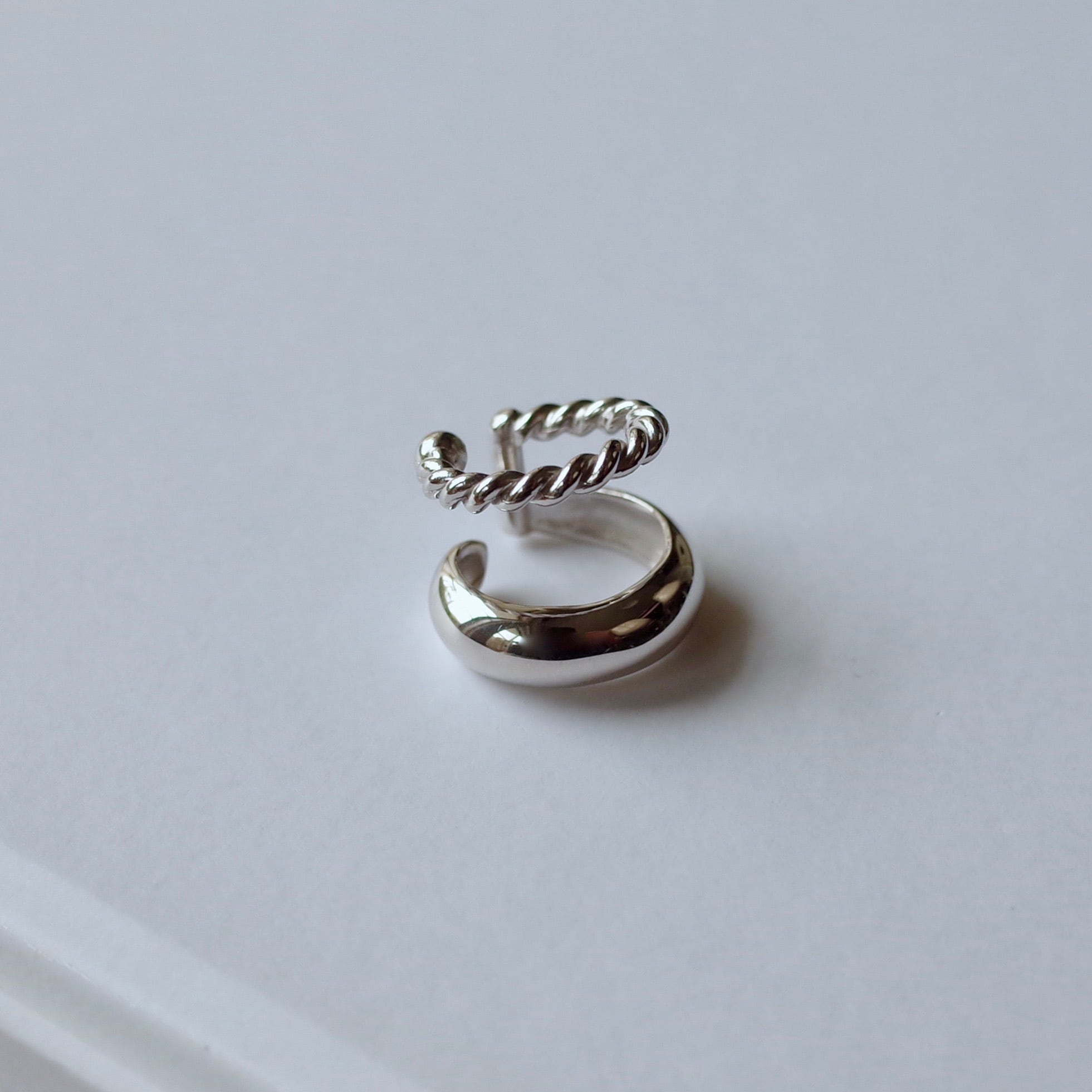 2本の細いラインを撚ったイヤーカフと、ぷっくり丸みのあるイヤーカフを重ねづけしたようなデザイン。