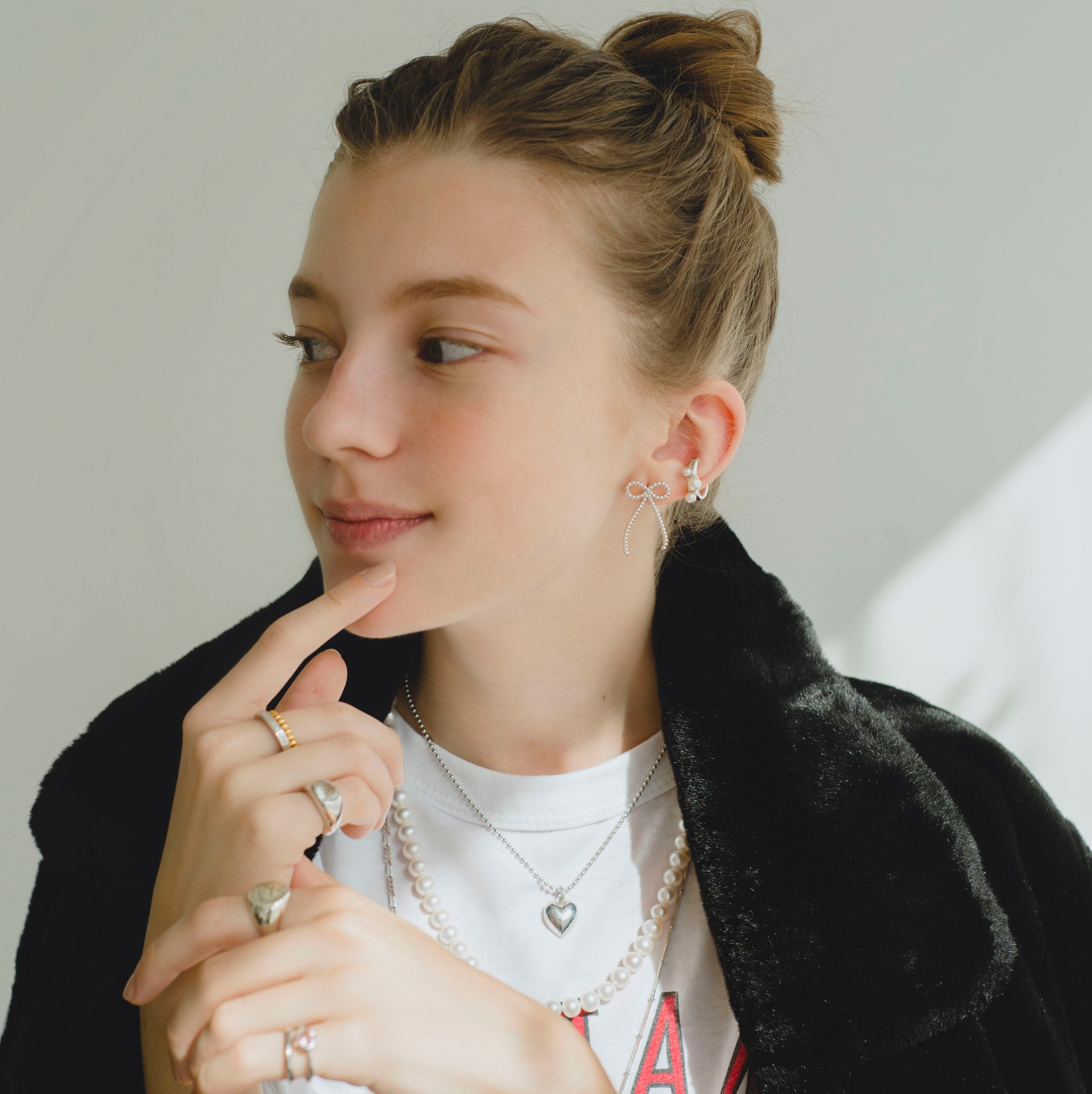 Ribbon-shaped earrings with a series of small balls. The design is not too sweet, so we recommend wearing them with simple pants styles or boyish wear to enjoy a less sweet look.