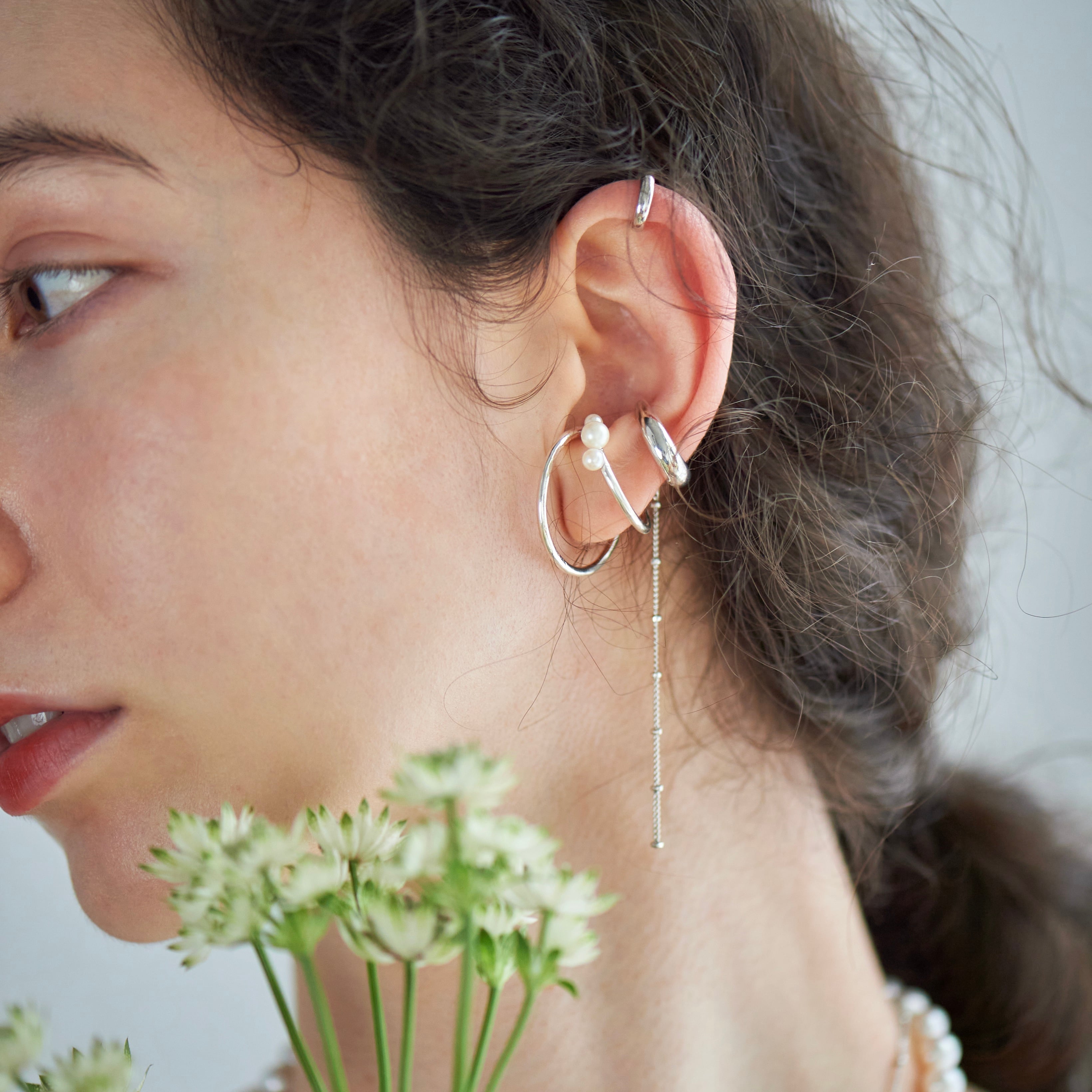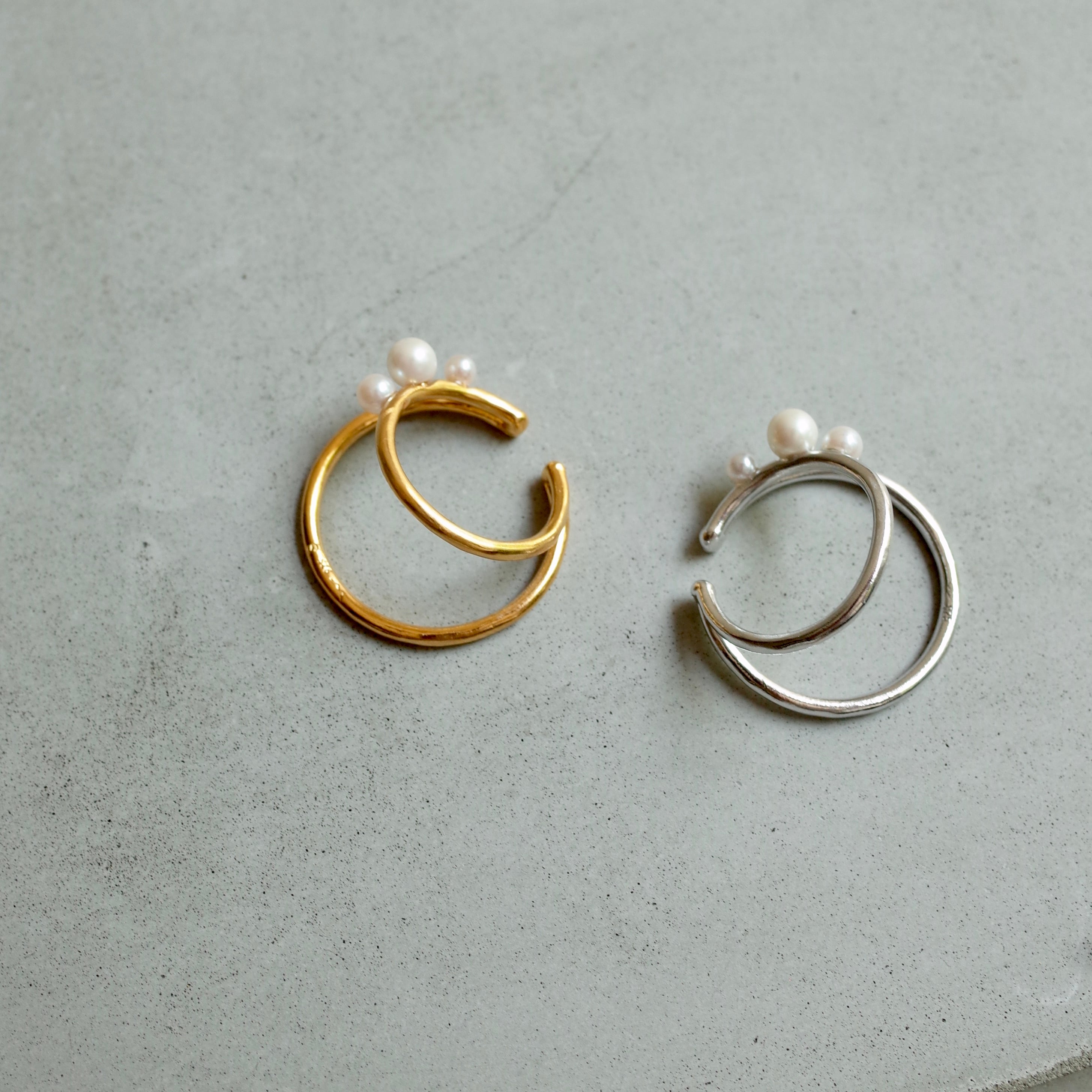 大小2つを重ねづけしたような立体感が特徴で、warmthでは定番のイヤーカフにパール付きのバージョンが登場しました。