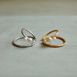 The large ring is simple in design and can be worn suspended from the earlobe, while the small ring has three pearls that are placed inside the ear.